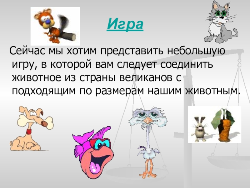 соединить животное из страны великанов с подходящим по размерам нашим животным.