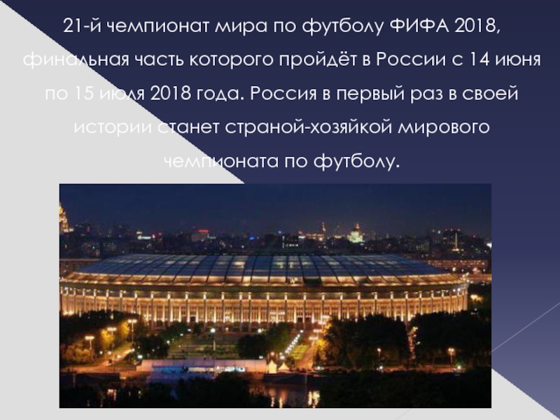 в России с 14 июня по 15 июля 2018 года. Россия в первый раз в своей истории станет страной-хозяйкой мирового чемпионата по футболу.