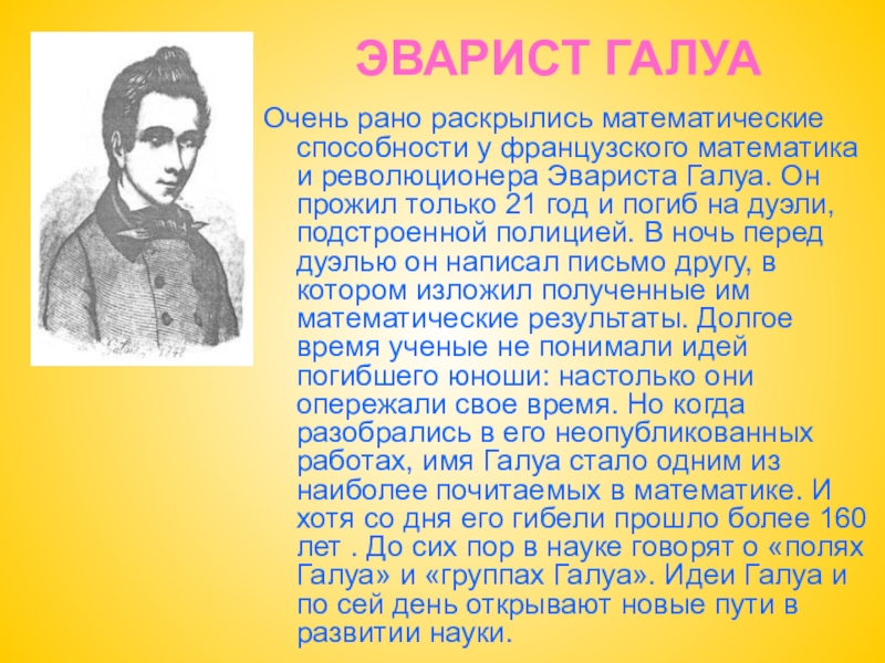 Эвариста Галуа. Он прожил только 21 год и погиб на дуэли, подстроенной полицией. В ночь перед дуэлью он написал письмо другу, в котором изложил полученные им математические результаты. Долгое время ученые не понимали идей погибшего юноши: настолько они опережали свое время. Но когда разобрались в его неопубликованных работах, имя Галуа стало одним из наиболее почитаемых в математике. И хотя со дня его гибели прошло более 160 лет . До сих пор в науке говорят о «полях Галуа» и «группах Галуа». Идеи Галуа и по сей день открывают новые пути в развитии науки.
