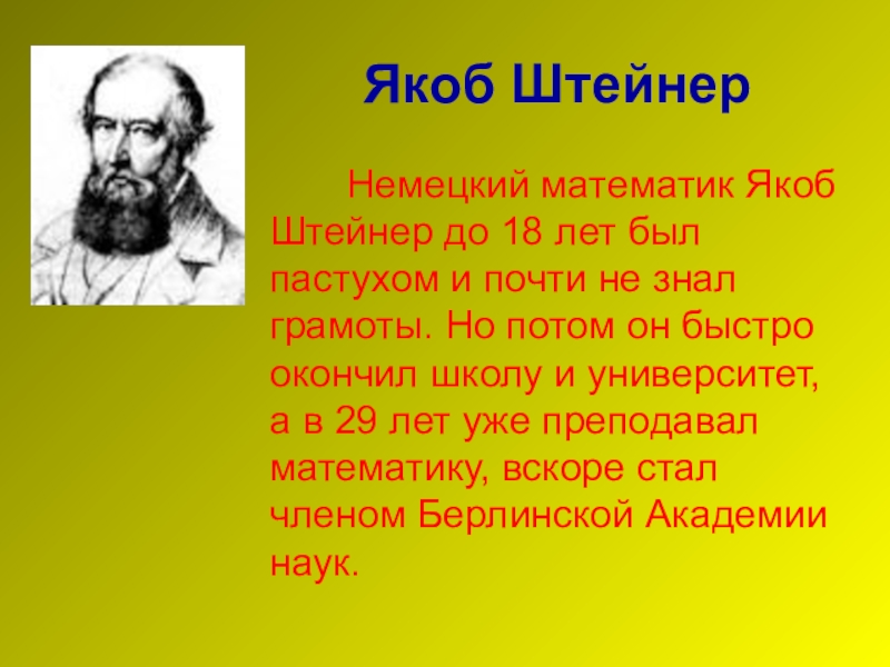 из крупнейших математиков XIX века (его даже называли «царем математики») . Рассказывают, что в трехлетнем возрасте он удивил окружающих, поправив расчеты своего отца с каменщиками. Однажды в школе (Гауссу было 10 лет) учитель предложил сложить числа от 1 до 100. пока он диктовал задания у Гаусса был готов ответ. На его грифельной доске было написано 101*50=5050. изумленный учитель понял, что встретил самого способного ученика в своей жизни. В дальнейшем Гаусс сделал много замечательных открытий в математике.