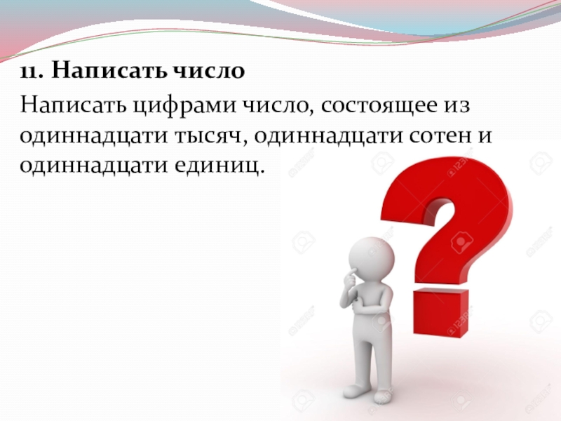 11. Написать числоНаписать цифрами число, состоящее из одиннадцати тысяч, одиннадцати сотен и одиннадцати единиц.