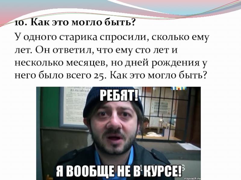 10. Как это могло быть?У одного старика спросили, сколько ему лет. Он ответил, что ему сто лет