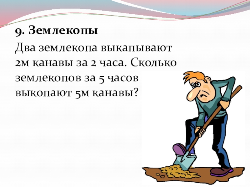 9. ЗемлекопыДва землекопа выкапывают 2м канавы за 2 часа. Сколько землекопов за 5 часов выкопают 5м канавы?