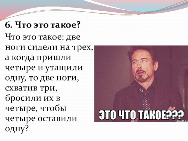 6. Что это такое?Что это такое: две ноги сидели на трех, а когда пришли четыре и утащили