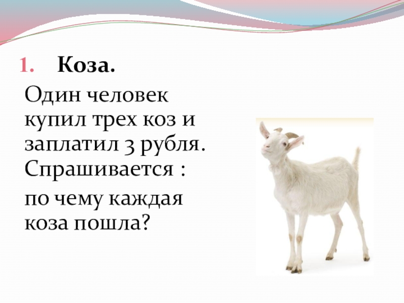Коза.Один человек купил трех коз и заплатил 3 рубля. Спрашивается : по чему каждая коза пошла?
