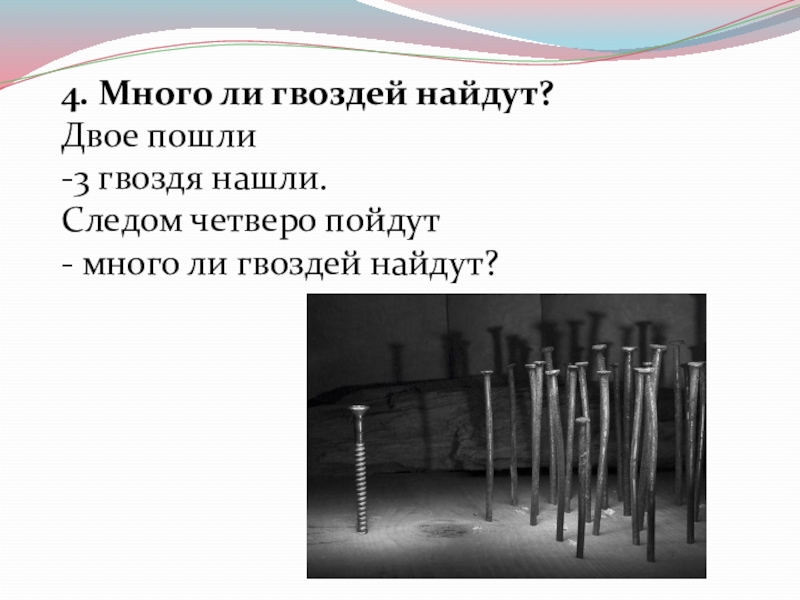 4. Много ли гвоздей найдут? Двое пошли -3 гвоздя нашли. Следом четверо пойдут - много ли гвоздей