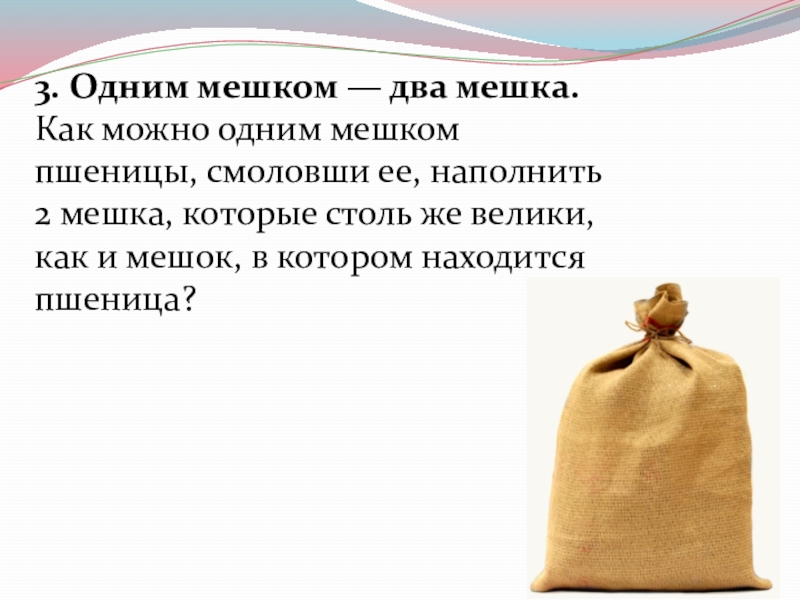3. Одним мешком — два мешка. Как можно одним мешком пшеницы, смоловши ее, наполнить 2 мешка, которые