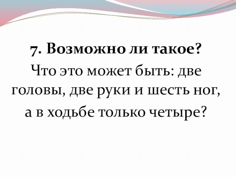 7. Возможно ли такое?Что это может быть: две головы, две руки и шесть ног, а в ходьбе