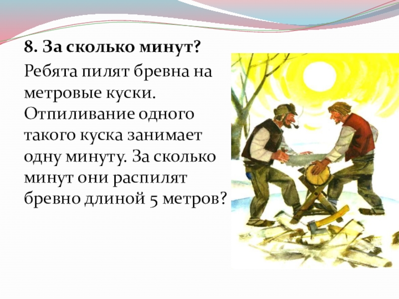 8. За сколько минут?Ребята пилят бревна на метровые куски. Отпиливание одного такого куска занимает одну минуту. За