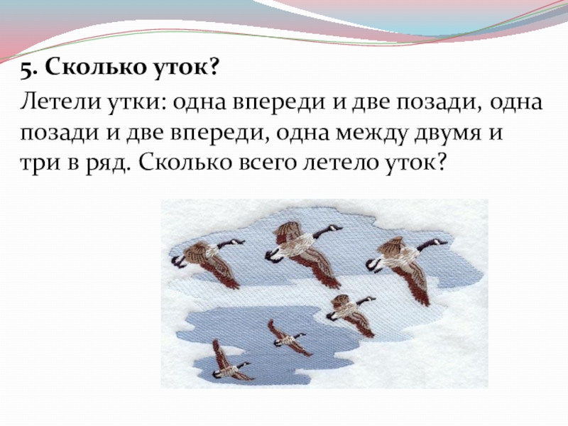 5. Сколько уток?Летели утки: одна впереди и две позади, одна позади и две впереди, одна между двумя