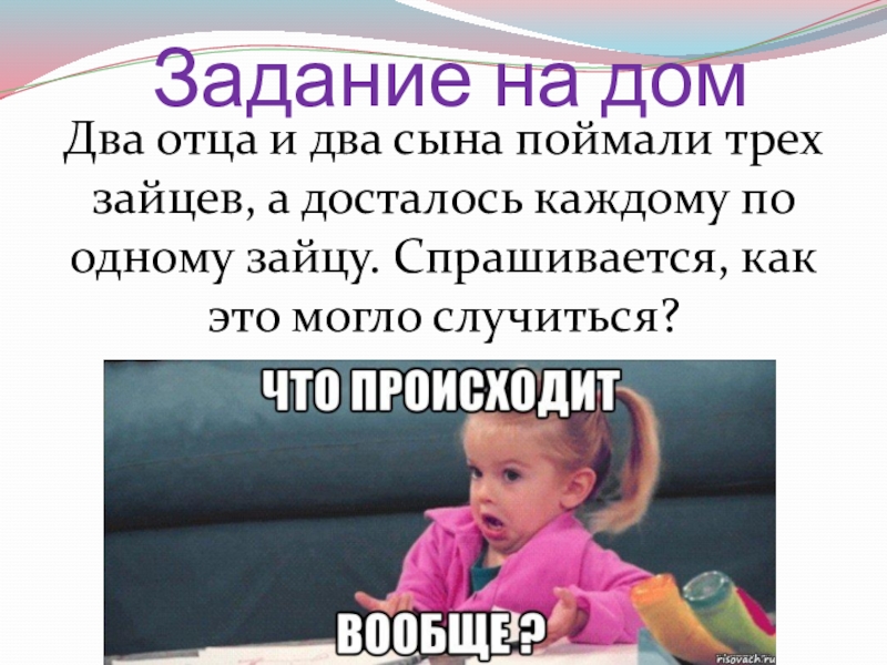 Задание на домДва отца и два сына поймали трех зайцев, а досталось каждому по одному зайцу. Спрашивается,