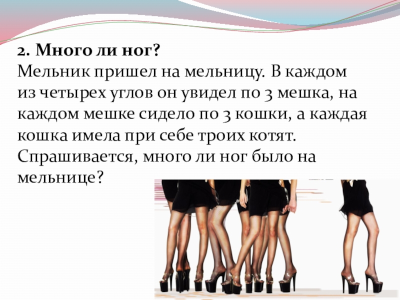 2. Много ли ног? Мельник пришел на мельницу. В каждом из четырех углов он увидел по 3
