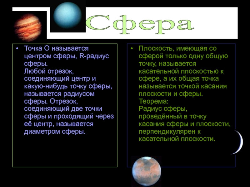 Плоскость, имеющая со сферой только одну общую точку, называется касательной плоскостью к сфере, а их общая точка называется точкой касания плоскости и сферы.