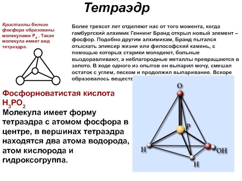 Молекула имеет форму тетраэдра с атомом фосфора в центре, в вершинах тетраэдра находятся два атома водорода, атом кислорода и гидроксогруппа.