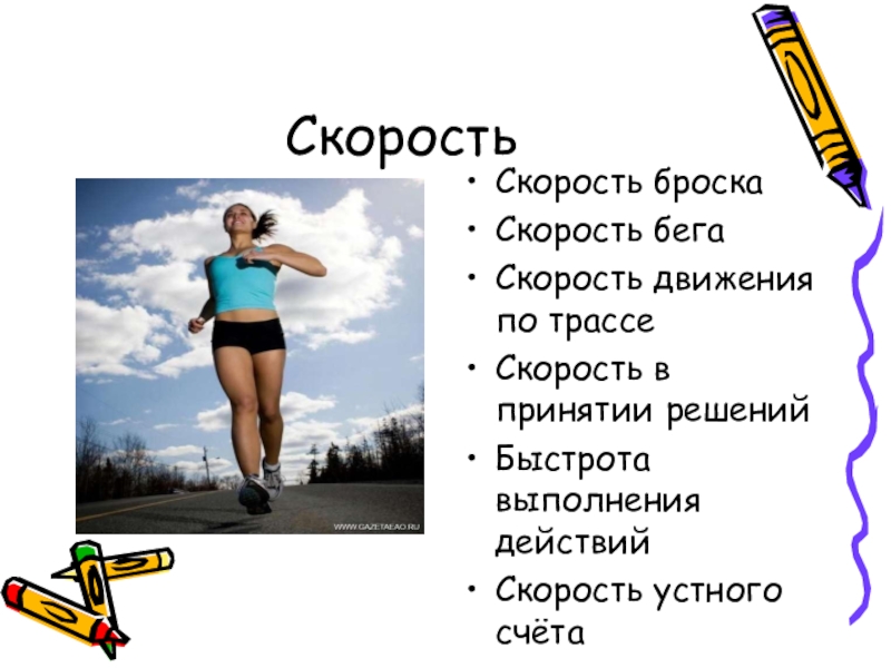 СкоростьСкорость броскаСкорость бегаСкорость движения по трассеСкорость в принятии решенийБыстрота выполнения действий Скорость устного счёта