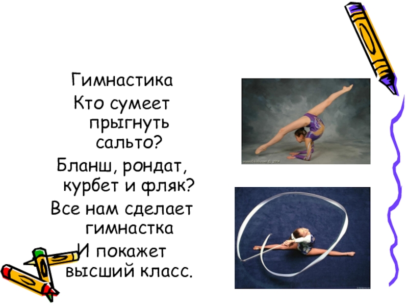 ГимнастикаКто сумеет прыгнуть сальто?Бланш, рондат, курбет и фляк?Все нам сделает гимнасткаИ покажет высший класс.