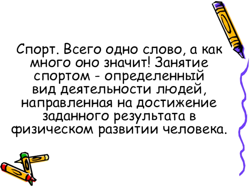 Спорт. Всего одно слово, а как много оно значит! Занятие спортом - определенный вид деятельности людей, направленная на