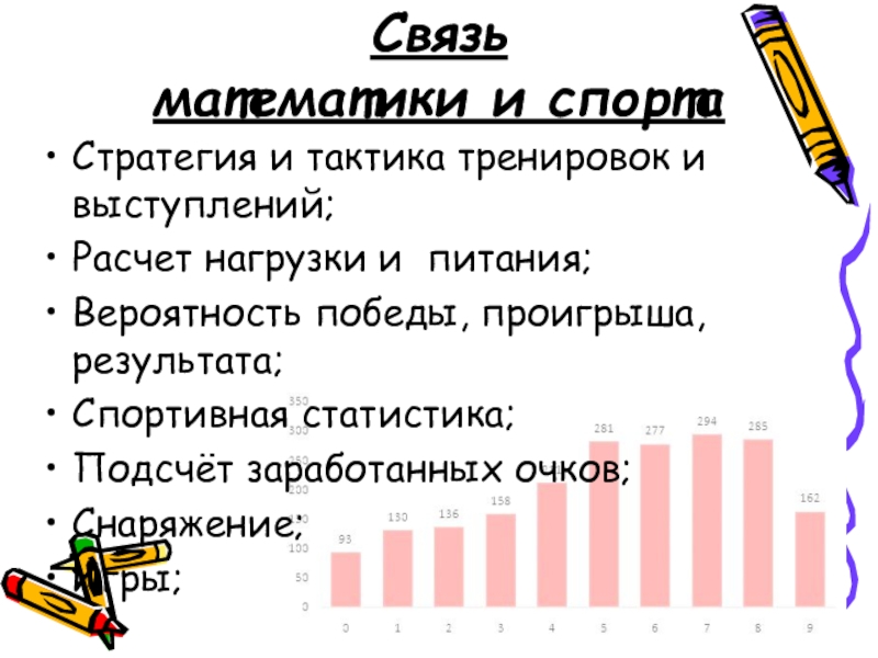 Связь  математики и спортаСтратегия и тактика тренировок и выступлений;Расчет нагрузки и питания;Вероятность победы, проигрыша, результата;Спортивная статистика;Подсчёт