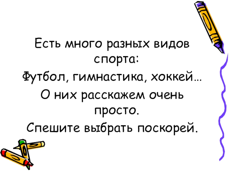 Есть много разных видов спорта:Футбол, гимнастика, хоккей…О них расскажем очень просто.Спешите выбрать поскорей.