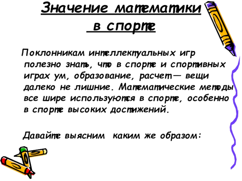 Значение математики   в спорте  Поклонникам интеллектуальных игр полезно знать, что в спорте и спортивных