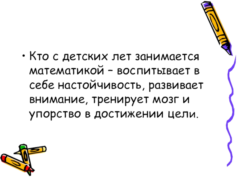 Кто с детских лет занимается математикой – воспитывает в себе настойчивость, развивает внимание, тренирует мозг и упорство