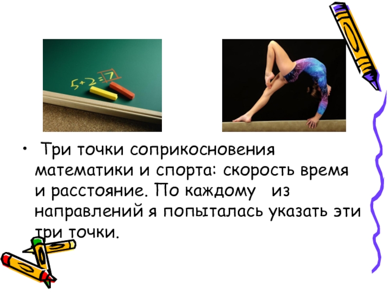 Три точки соприкосновения математики и спорта: скорость время и расстояние. По каждому  из направлений я