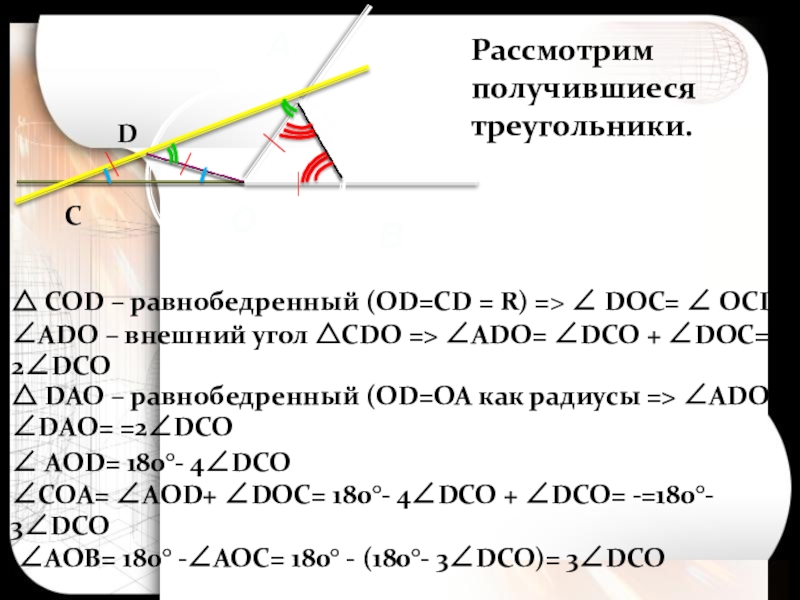 △ DАО – равнобедренный (OD=ОА как радиусы => ∠АDО= ∠DАО= =2∠DСО