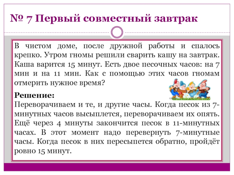 В чистом доме, после дружной работы и спалось крепко. Утром гномы решили сварить кашу на завтрак. Каша варится 15 минут. Есть двое песочных часов: на 7 мин и на 11 мин. Как с помощью этих часов гномам отмерить нужное время?