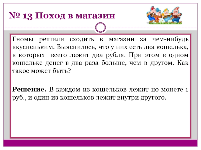 Решение. В каждом из кошельков лежит по монете 1 руб., и один из кошельков лежит внутри другого.