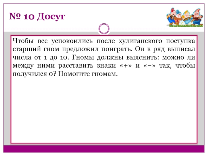 Чтобы все успокоились после хулиганского поступка старший гном предложил поиграть. Он в ряд выписал числа от 1 до 10. Гномы должны выяснить: можно ли между ними расставить знаки «+» и «−» так, чтобы получился 0? Помогите гномам.
