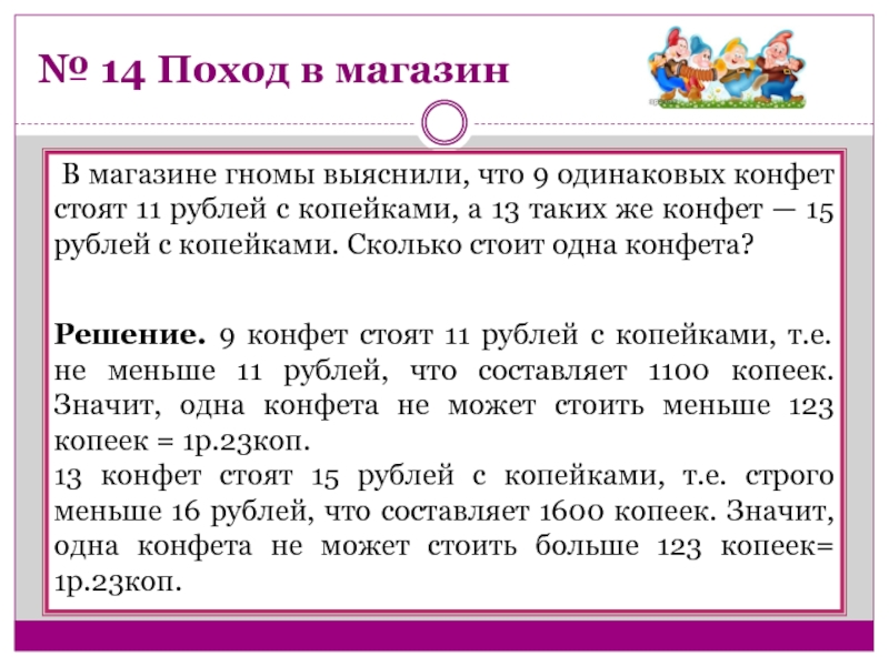 В магазине гномы выяснили, что 9 одинаковых конфет стоят 11 рублей с копейками, а 13 таких же конфет — 15 рублей с копейками. Сколько стоит одна конфета?