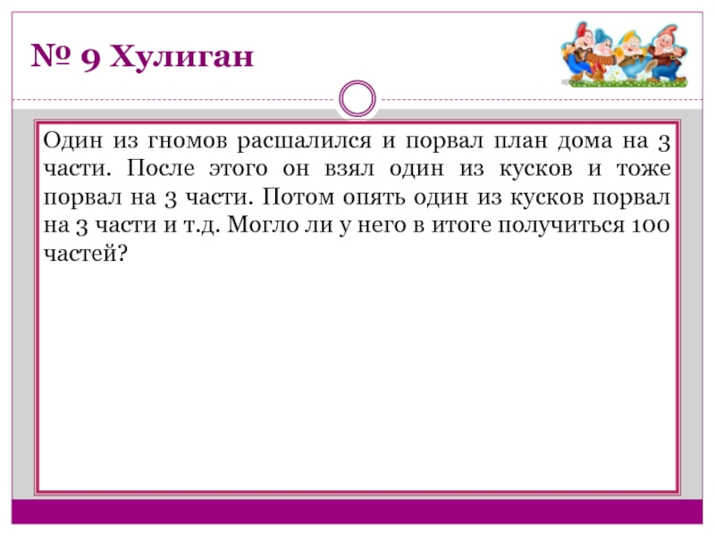 Один из гномов расшалился и порвал план дома на 3 части. После этого он взял один из кусков и тоже порвал на 3 части. Потом опять один из кусков порвал на 3 части и т.д. Могло ли у него в итоге получиться 100 частей?