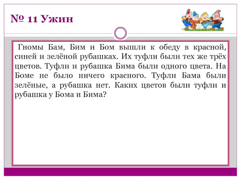 Гномы Бам, Бим и Бом вышли к обеду в красной, синей и зелёной рубашках. Их туфли были тех же трёх цветов. Туфли и рубашка Бима были одного цвета. На Боме не было ничего красного. Туфли Бама были зелёные, а рубашка нет. Каких цветов были туфли и рубашка у Бома и Бима?