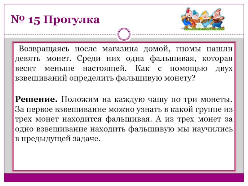 Возвращаясь после магазина домой, гномы нашли девять монет. Среди них одна фальшивая, которая весит меньше настоящей. Как с помощью двух взвешиваний определить фальшивую монету?