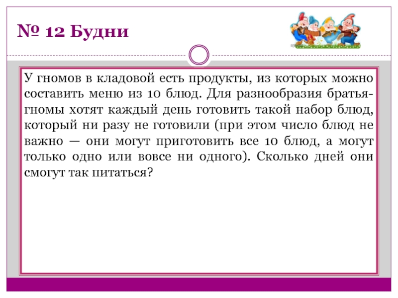У гномов в кладовой есть продукты, из которых можно составить меню из 10 блюд. Для разнообразия братья-гномы хотят каждый день готовить такой набор блюд, который ни разу не готовили (при этом число блюд не важно — они могут приготовить все 10 блюд, а могут только одно или вовсе ни одного). Сколько дней они смогут так питаться?