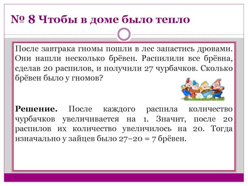 Решение. После каждого распила количество чурбачков увеличивается на 1. Значит, после 20 распилов их количество увеличилось на 20. Тогда изначально у зайцев было 27−20 = 7 брёвен.
