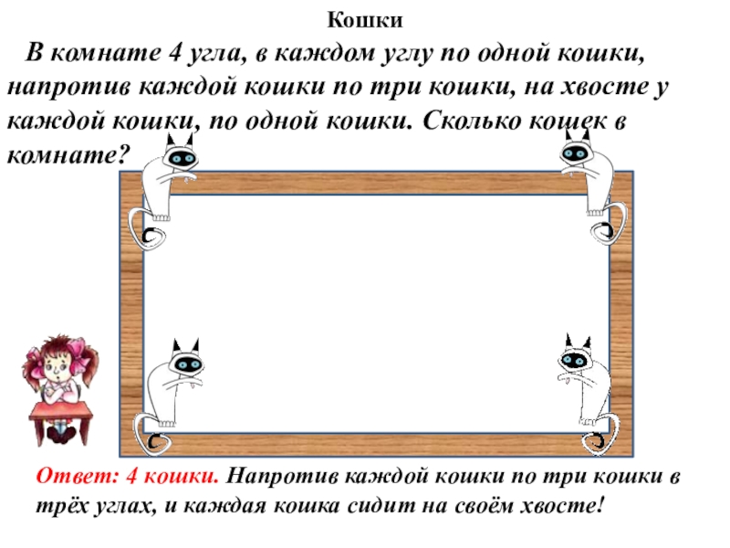 Ответ: 4 кошки. Напротив каждой кошки по три кошки в трёх углах, и каждая кошка сидит на своём хвосте!