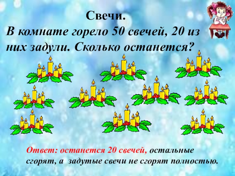 Ответ: останется 20 свечей, остальные сгорят, а задутые свечи не сгорят полностью.
