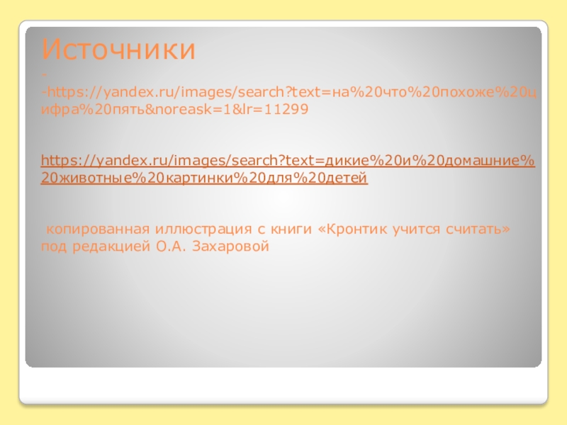 Источники - -https://yandex.ru/images/search?text=на%20что%20похоже%20цифра%20пять&noreask=1&lr=11299   https://yandex.ru/images/search?text=дикие%20и%20домашние%20животные%20картинки%20для%20детей    копированная иллюстрация с книги «Кронтик учится считать» под