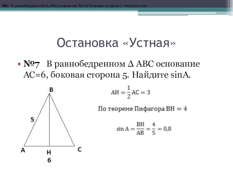 №7 В равнобедренном Δ АВС основание АС=6, боковая сторона 5. Найдите sinA.