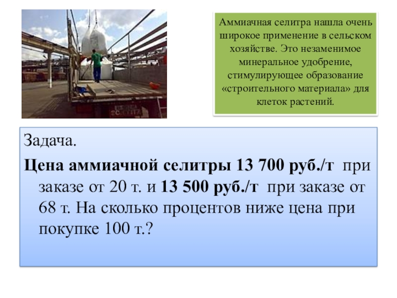 Цена аммиачной селитры 13 700 руб./т при заказе от 20 т. и 13 500 руб./т при заказе от 68 т. На сколько процентов ниже цена при покупке 100 т.?