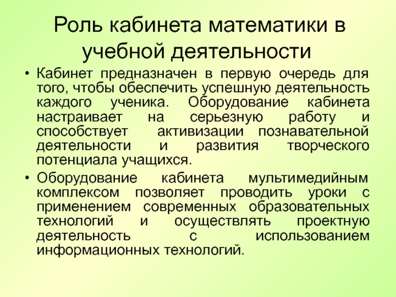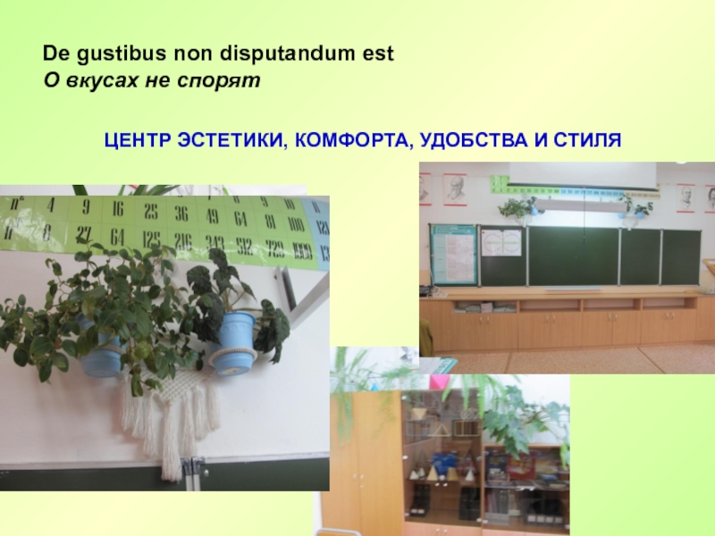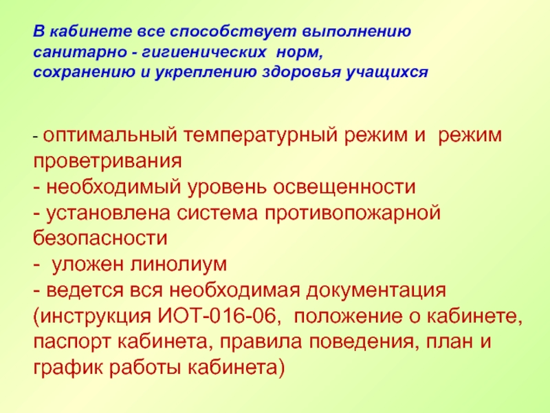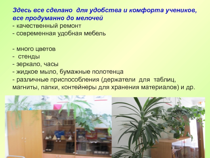 Кабинет просторный, светлый, ухоженный, чистота и порядок, цветы, удобная мебель, современная техника, культура оформления и интерьер способствуют повышению качества образовательного и воспитательного процесса, создают атмосферу домашнего уюта, позволяют сохранять и укреплять здоровье наших детей.