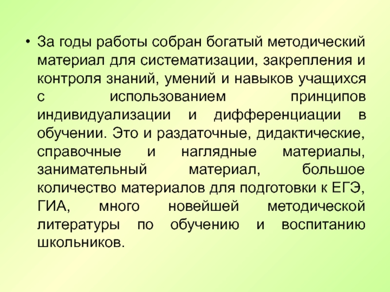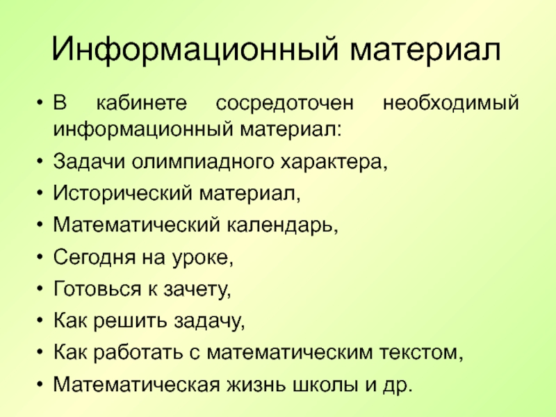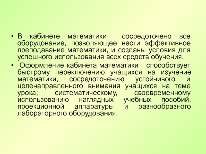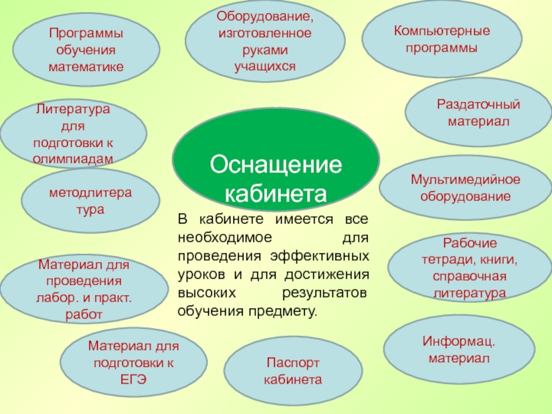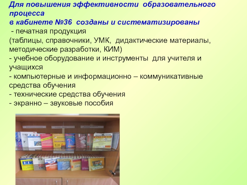 В кабинете имеется все необходимое для проведения эффективных уроков и для достижения высоких результатов обучения предмету.