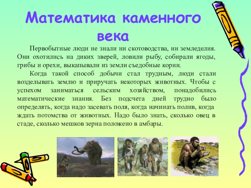 Когда такой способ добычи стал трудным, люди стали возделывать землю и приручать некоторых животных. Чтобы с успехом заниматься сельским хозяйством, понадобились математические знания. Без подсчета дней трудно было определять, когда надо засевать поля, когда начинать полив, когда ждать потомства от животных. Надо было знать, сколько овец в стаде, сколько мешков зерна положено в амбары.