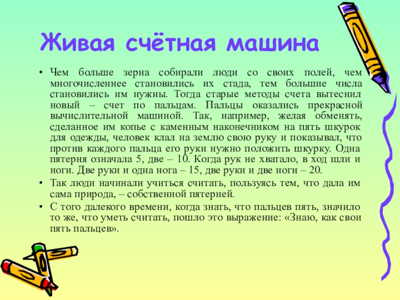 многочисленнее становились их стада, тем большие числа становились им нужны. Тогда старые методы счета вытеснил новый – счет по пальцам. Пальцы оказались прекрасной вычислительной машиной. Так, например, желая обменять, сделанное им копье с каменным наконечником на пять шкурок для одежды, человек клал на землю свою руку и показывал, что против каждого пальца его руки нужно положить шкурку. Одна пятерня означала 5, две – 10. Когда рук не хватало, в ход шли и ноги. Две руки и одна нога – 15, две руки и две ноги – 20.