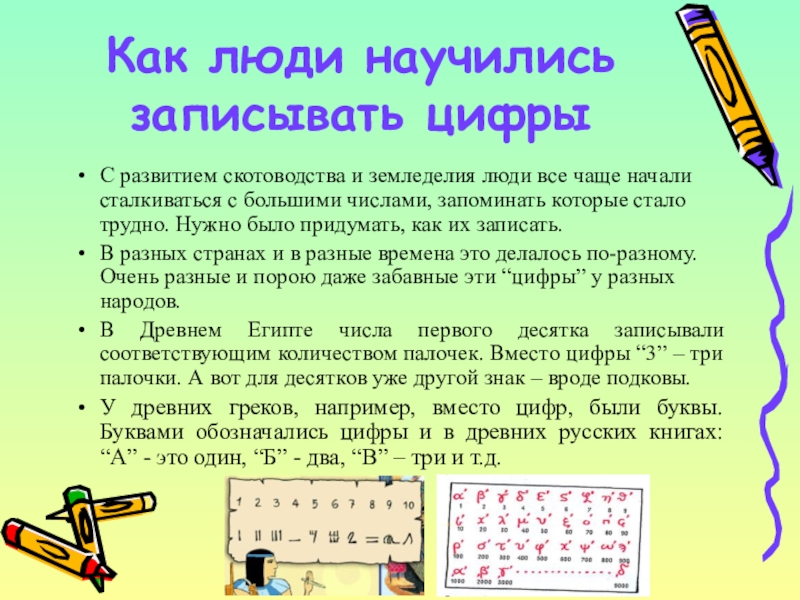 У древних греков, например, вместо цифр, были буквы. Буквами обозначались цифры и в древних русских книгах: “А” - это один, “Б” - два, “В” – три и т.д.