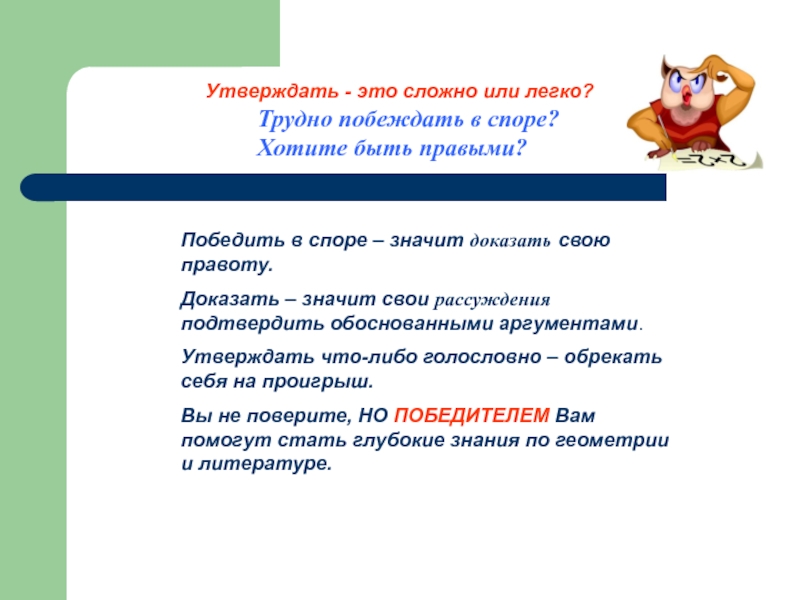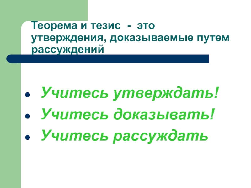 Доказать – значит свои рассуждения подтвердить обоснованными аргументами.
