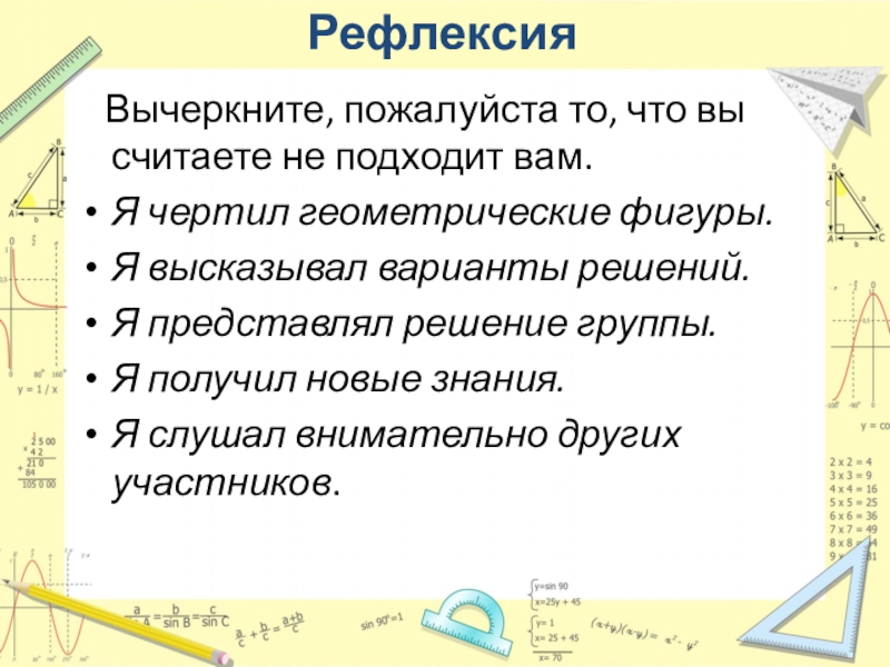 Рефлексия  Вычеркните, пожалуйста то, что вы считаете не подходит вам.Я чертил геометрические фигуры.Я высказывал варианты решений.Я