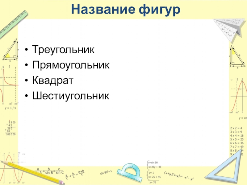 Название фигурТреугольникПрямоугольникКвадратШестиугольник