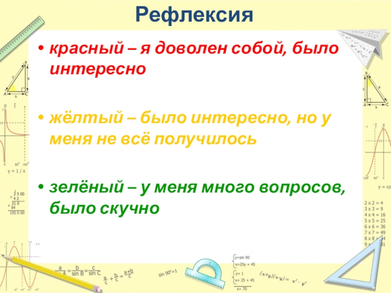 Рефлексия красный – я доволен собой, было интересножёлтый – было интересно, но у меня не всё получилосьзелёный